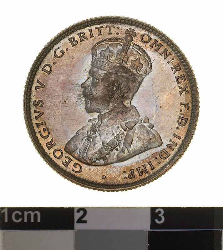 Crowned and robed bust of George V facing left; around, GEORGIVS V D.G. BRITT: OMN: REX F.D. IND: IMP: ; below bust in small lettering the artist's initials B.M.