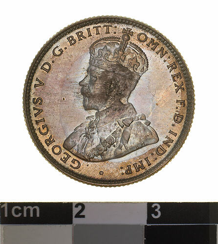 A silver coin (23.5 mm diameter with milled edge) featuring a crowned and robed bust of George V facing left; around, GEORGIVS V D.G. BRITT: OMN: REX F.D. IND: IMP: ; below bust in small lettering the artist's initials B.M. The reverse features the Ensigns Armorial of the Commonwealth of Australia, as authorised by Royal Warrent 7th May 1908 - composed of a simple shield enclosing a cross of Saint George on which are five six-pointed stars, around the outside of which are six small escutcheons, i.e., small shields. The shield is supported by a kangaroo and an emu standing on a grassy mound. Above the shield a crest, the seven-pointed star of Federation on a wreath. Below on a ribbon the motto ADVANCE AUSTRALIA is inscribed. Around above, ONE SHILLING and below, between arrow heads, the date, 1936.