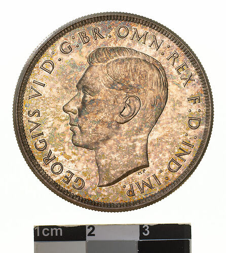 A silver coin (38 mm diameter with milled edge) featuring a bare head of George VI facing left; around, GEORGIVS VI D: G: BR: OMN: REX F: D: IND: IMP: ; below the head in small lettering the artist's initials HP. The reverse features the Imperial crown with the date 1937 below; around above, COMMONWEALTH OF AUSTRALIA; around below, . ONE CROWN . The artist's initials K.G are in small letters in the field at the bottom right of the crown.