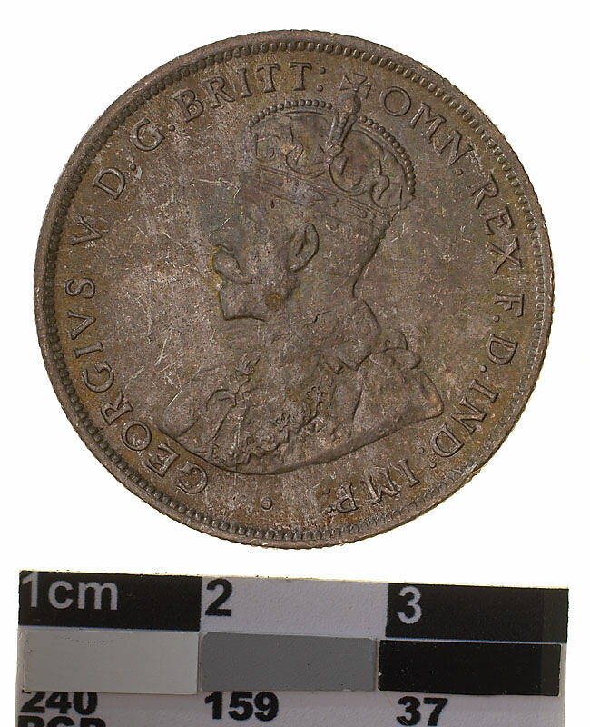 Crowned and robed bust of George V facing left; around, GEORGIVS V D. G. BRITT: OMN: REX F. D. IND: IMP: ; below bust in small lettering the artist's initials B.M.