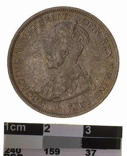 A silver coin (28 mm diameter with milled edge) featuring a crowned and robed bust of George V facing left; around, GEORGIVS V D. G. BRITT: OMN: REX F. D. IND: IMP: ; below bust in small lettering the artist's initials B.M. The reverse features the Ensigns Armorial of the Commonwealth of Australia, as authorised by Royal Warrent 7th May 1908 - composed of a simple shield enclosing a cross of Saint George on which are five six-pointed stars, around the outside of which are six small escutcheons, i.e., small shields. The shield is supported by a kangaroo and an emu standing on a grassy mound. Above the shield a crest, the seven-pointed star of Federation on a wreath. Below on a ribbon the motto ADVANCE AUSTRALIA is inscribed. Around above, ONE FLORIN - TWO SHILLINGS and below, between arrow heads, the date, 1915