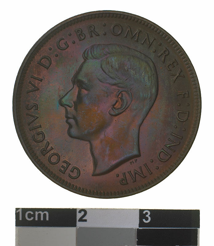 Bare head of George VI facing left; around, GEORGIVS VI D:G: BR: OMN: REX F:D: IND: IMP: ; below head in small lettering the artist's initials HP.