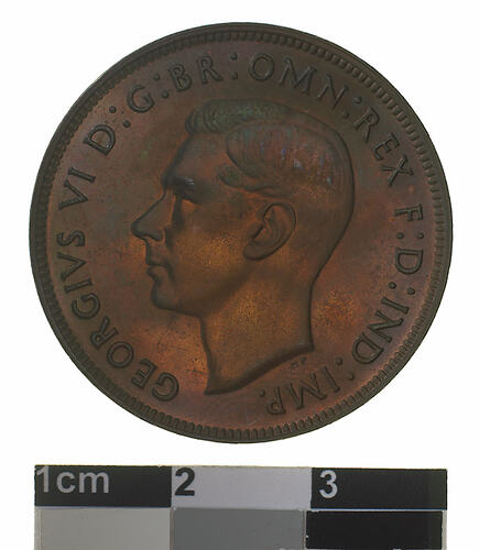 A bronze coin (30.8 mm diameter with plain edge) featuring a bare head of George VI facing left; around, GEORGIVS VI D:G: BR: OMN: REX F:D: IND: IMP: ; below head in small lettering the artist's initials HP. The reverse features a kangaroo leaping to the left; around above AUSTRALIA, around below, PENNY.; the Federation star is in the field to the left of the kangaroo and the date, 1947 is in the field below its tail. The artist's initials KG are above the tip of the tail. A tiny dot after the word PENNY is the mint mark for Perth for this issue.