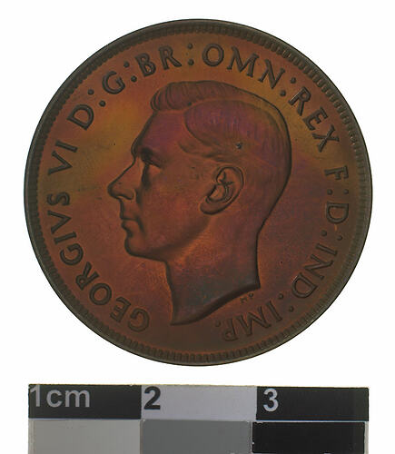A bronze coin (30.8 mm diameter with plain edge) featuring a bare head of George VI facing left; around, GEORGIVS VI D:G: BR: OMN: REX F:D: IND: IMP: ; below head in small lettering the artist's initials HP. The reverse features a kangaroo leaping to the left; around above AUSTRALIA, around below, PENNY.; the Federation star is in the field to the left of the kangaroo and the date, 1948 is in the field below its tail. The artist's initials KG are above the tip of the tail. A tiny dot after the word PENNY is the mint mark for Perth for this issue.