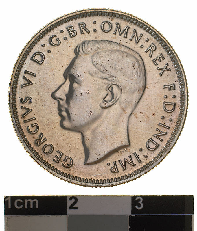 A silver coin (28 mm diameter with milled edge) featuring a bare head of George VI facing left; around, GEORGIVS VI D:G: BR: OMN: REX F:D: IND: IMP: ; below bust in small lettering the artist's initials H.P. The reverse is based on the Arms of the Commonwealth of Australia, as authorised by Royal Warrant 19 September 1912 - composed of a shield divided into six parts, each containing a representation of the badge of a State. The shield is supported by a kangaroo and an emu standing on a grassy mound accompanied by small branches of wattle. Above the shield is a crown instead of the Federation Star. Around above, FLORIN between two seven pointed stars; and below, in the exergue, the date, 1945 curved below which, AUSTRALIA. The artist's initials KG are in the field above the back of the emu.