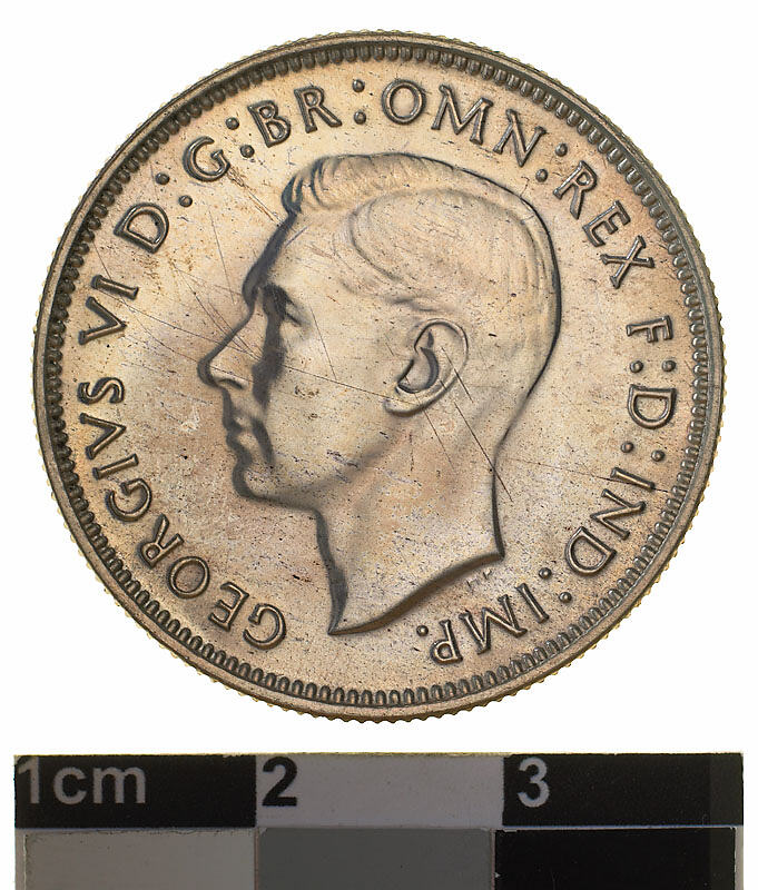 A silver coin (28 mm diameter with milled edge) featuring a bare head of George VI facing left; around, GEORGIVS VI D:G: BR: OMN: REX F:D: IND: IMP: ; below bust in small lettering the artist's initials H.P. The reverse is based on the Arms of the Commonwealth of Australia, as authorised by Royal Warrant 19 September 1912 - composed of a shield divided into six parts, each containing a representation of the badge of a State. The shield is supported by a kangaroo and an emu standing on a grassy mound accompanied by small branches of wattle. Above the shield is a crown instead of the Federation Star. Around above, FLORIN between two seven pointed stars; and below, in the exergue, the date, 1945 curved below which, AUSTRALIA. The artist's initials KG are in the field above the back of the emu.