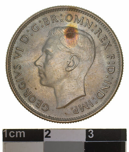 A silver coin (28 mm diameter with milled edge) featuring a bare head of George VI facing left; around, GEORGIVS VI D:G: BR: OMN: REX F:D: IND: IMP: ; below bust in small lettering the artist's initials H.P. This was a trial coin and has 66 scratched in field under VI D: to indicate the experimental silver percentage. The reverse is based on the Arms of the Commonwealth of Australia, as authorised by Royal Warrant 19 September 1912 - composed of a shield divided into six parts, each containing a representation of the badge of a State. The shield is supported by a kangaroo and an emu standing on a grassy mound accompanied by small branches of wattle. Above the shield is a crown. Around above, FLORIN between two seven pointed stars; and below, in the exergue, the date, 1945 curved below which, AUSTRALIA. The artist's initials KG are in the field above the back of the emu. See Notes Tab for details.