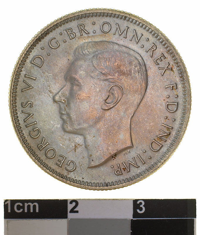 A silver coin (28 mm diameter with milled edge) featuring a bare head of George VI facing left; around, GEORGIVS VI D:G: BR: OMN: REX F:D: IND: IMP: ; below bust in small lettering the artist's initials H.P. This was a trial coin and has 66 scratched in field under VI D: to indicate the experimental silver percentage. The reverse is based on the Arms of the Commonwealth of Australia, as authorised by Royal Warrant 19 September 1912 - composed of a shield divided into six parts, each containing a representation of the badge of a State. The shield is supported by a kangaroo and an emu standing on a grassy mound accompanied by small branches of wattle. Above the shield is a crown. Around above, FLORIN between two seven pointed stars; and below, in the exergue, the date, 1945 curved below which, AUSTRALIA. The artist's initials KG are in the field above the back of the emu. See Notes Tab for details.
