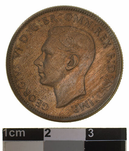 Bare head of George VI facing left; around, GEORGIVS VI D:G: BR: OMN: REX F:D: IND: IMP: ; below bust in small lettering the artist's initials H.P.