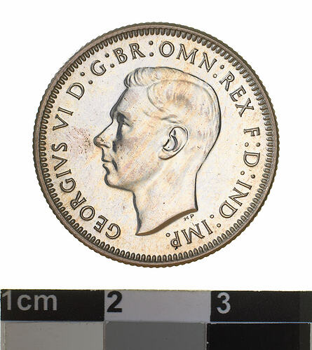 A silver coin (23.5 mm diameter with milled edge) featuring a bare head of George VI facing left; around, GEORGIVS VI D: G: BR: OMN: REX F: D: IND: IMP: ; below bust in small lettering the artist's initials H.P.. The reverse features a ram's head facing three-quarters left; around above, AUSTRALIA, around below between two Federation stars, SHILLING . 1945. The artist's initials, KG is in the field above the star on the right.