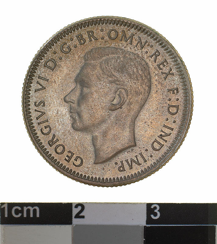 A silver coin (23.5 mm diameter with milled edge) featuring a bare head of George VI facing left; around, GEORGIVS VI D: G: BR: OMN: REX F: D: IND: IMP: ; below bust in small lettering the artist's initials H.P.. The reverse features a ram's head facing three-quarters left; around above, AUSTRALIA, around below between two Federation stars, . SHILLING . 1946. The artist's initials, KG is in the field above the star on the right.