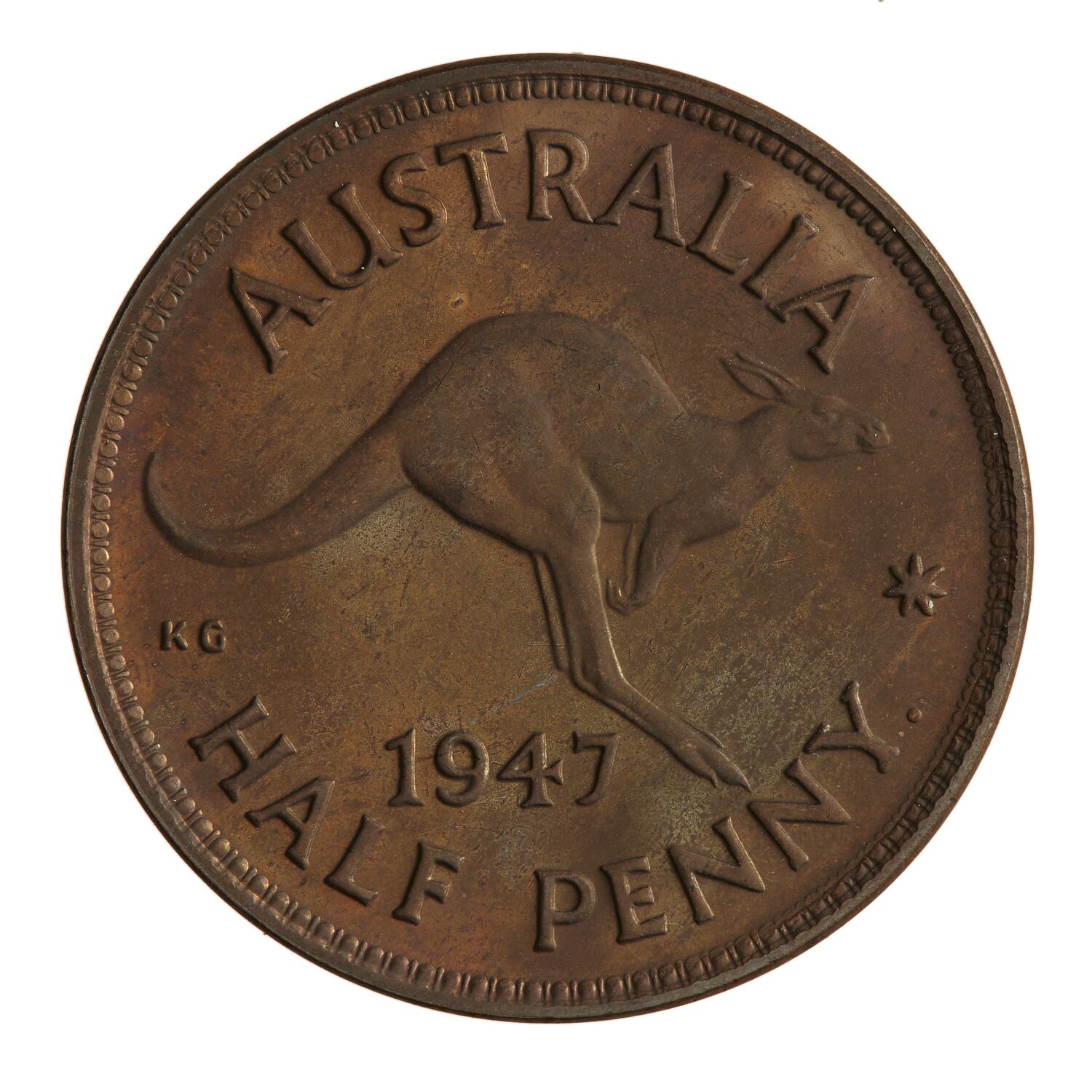 A bronze coin (25.5 mm diameter with plain edge) featuring a bare head of George VI facing left; around, GEORGIVS VI D: G: BR: OMN: REX F: D: IND: IMP: ; below the head in small lettering the artist's initials HP. The reverse features, a kangaroo leaping right; around above, AUSTRALIA; around below HALF PENNY. (the mint mark is the small dot after the word PENNY). The date, 1947 is below the Kangaroo and the Federation star follows the word PENNY. The artist's initials, KG are below the kangaroo's tail near the rim.