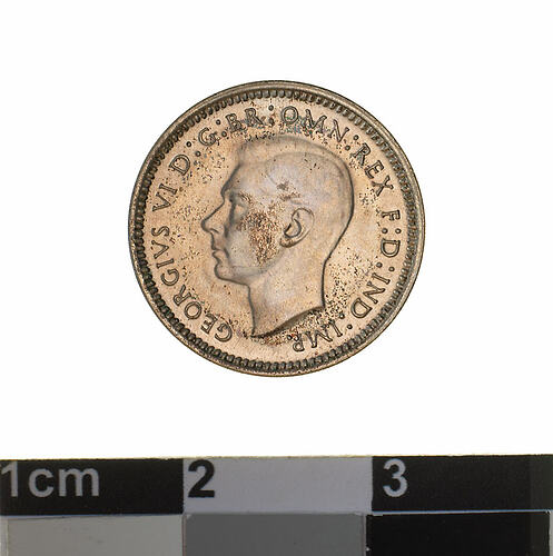 A silver coin (16 mm diameter with plain edge) featuring a bare head of George VI facing left; around, GEORGIVS VI D: G: BR: OMN: REX F: D: IND: IMP. ; below bust in small lettering the artist's initials H.P.. The reverse features three ears of wheat held by a curved ribbon. Around above, AUSTRALIA; around below devided into two by the stalks of the wheat, THREE PENCE, above, across the middle of the coin the date devided into two by the ears, 1947. The artist's initials tucked into the first and last bends in the ribbon K G.