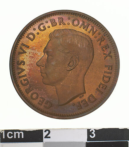 A proof bronze coin (25.5 mm diameter with plain edge) featuring a bare head of George VI facing left; around, GEORGIVS VI D: G: BR: OMN: REX FIDEI DEF. below the head in small lettering are the artist's initials HP. The reverse features, a kangaroo leaping right; around above, AUSTRALIA; around below HALF PENNY. (small dot after the word PENNY). The date, 1949 is below the Kangaroo and the Federation star follows the word PENNY. The artist's initials, KG are below the kangaroo's tail near the rim.