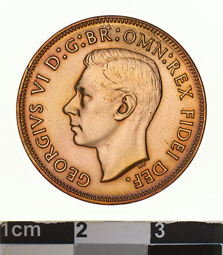 A proof bronze coin (25.5 mm diameter with plain edge) featuring a bare head of George VI facing left; around, GEORGIVS VI D: G: BR: OMN: REX FIDEI DEF. below the head in small lettering are the artist's initials HP. The reverse features, a kangaroo leaping right; around above, AUSTRALIA; around below HALF PENNY (no small dot after the word PENNY). The date, 1952 is below the Kangaroo and the Federation star follows the word PENNY. The artist's initials, KG are below the kangaroo's tail near the rim. The mint mark is a small dot after the word AUSTRALIA near the rim