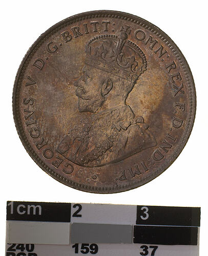 Crowned and robed bust of George V facing left; around, GEORGIVS V D. G. BRITT: OMN: REX F. D. IND: IMP: ; below bust in small lettering the artist's initials B.M.
