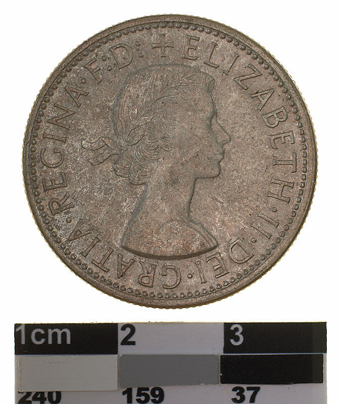 Bust of Elizabeth II laureate right; around, + ELIZABETH . II . DEI . GRATIA . REGINA . F:D: