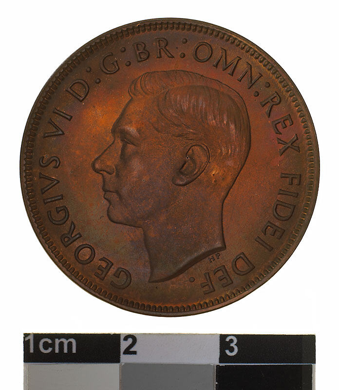Bare head of George VI facing left; around, GEORGIVS VI D:G: BR: OMN: REX FIDEI DEF. ; below head in small lettering the artist's initials HP.