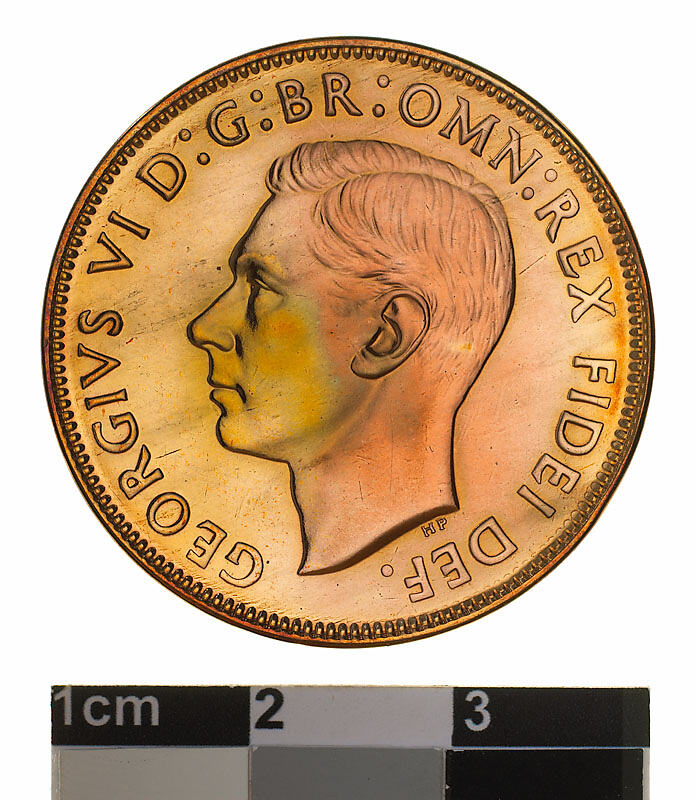 Bare head of George VI facing left; around, GEORGIVS VI D:G: BR: OMN: REX FIDEI DEF. ; below head in small lettering the artist's initials HP.