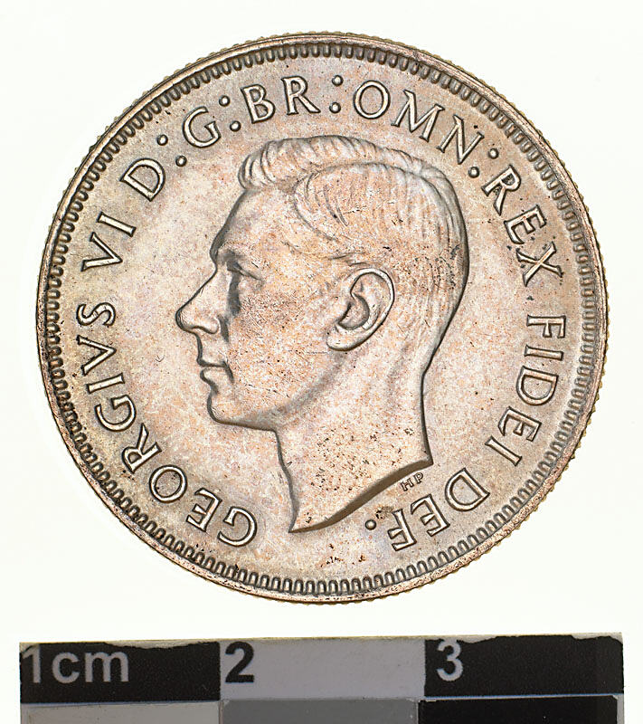 A silver coin (28 mm diameter with milled edge) featuring a bare head of George VI facing left; around, GEORGIVS VI D: G: BR: OMN: REX FIDEI DEF. ; below bust in small lettering the artist's initials H.P. The reverse is based on the Arms of the Commonwealth of Australia, as authorised by Royal Warrant 19 September 1912 - composed of a shield divided into six parts, each containing a representation of the badge of a State. The shield is supported by a kangaroo and an emu standing on a grassy mound accompanied by small branches of wattle. Above the shield is a crown. Around above, FLORIN between two seven pointed stars; and below, in the exergue, the date, 1951 curved below which, AUSTRALIA. The artist's initials KG are in the field above the back of the emu. See Notes Tab for details.