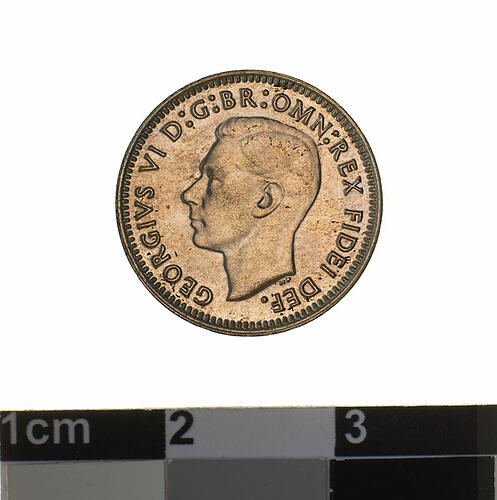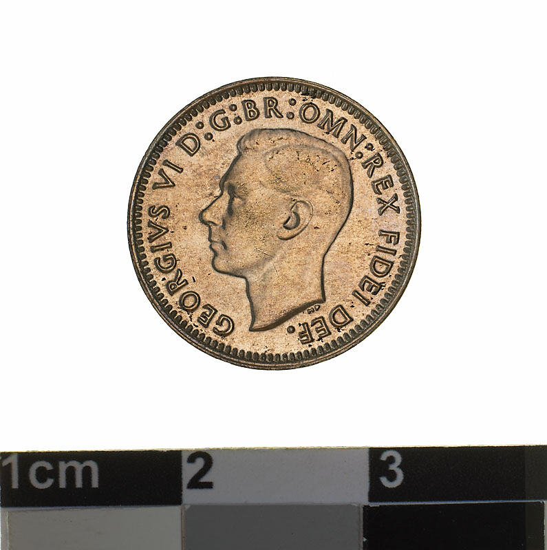 A silver coin (16 mm diameter with plain edge) featuring a bare head of George VI facing left; around, GEORGIVS VI D: G: BR: OMN: REX FIDEI DEF.; below bust in small lettering the artist's initials H.P.. The reverse features three ears of wheat held by a curved ribbon. Around above, AUSTRALIA; around below divided into two by the stalks of the wheat, THREE PENCE, above, across the middle of the coin the date divided into two by the ears, 1952. The artist's initials tucked into the first and last folds in the ribbon K G.