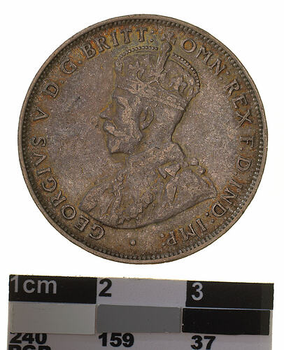 Obverse: GEORGIVS V D. G. BRITT: OMN: REX F. D. IND: IMP: Reverse: ONE FLORIN - TWO SHILLINGS 1915 H ADVANCE AUSTRALIA