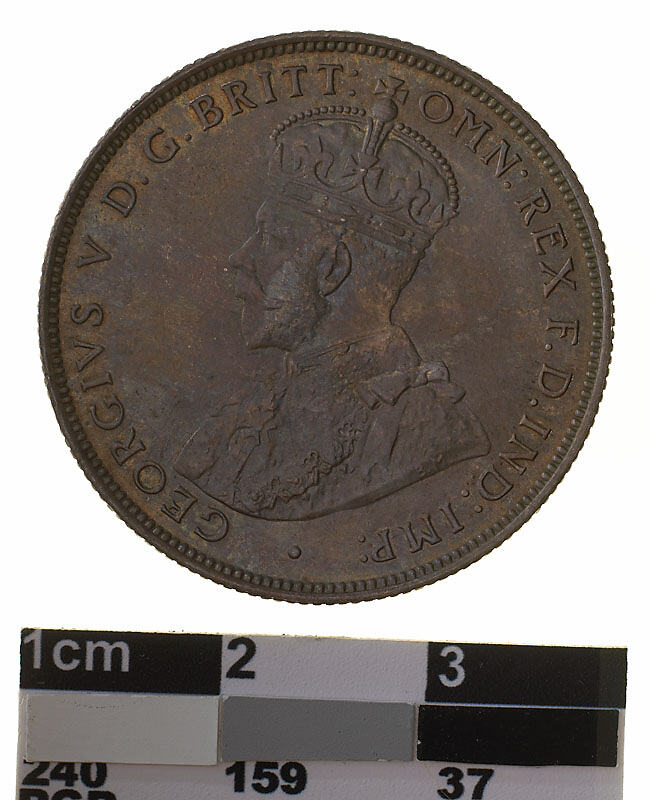 Crowned and robed bust of George V facing left; around, GEORGIVS V D. G. BRITT: OMN: REX F. D. IND: IMP: ; below bust in small lettering the artist's initials B.M.