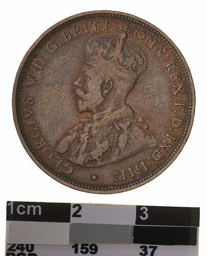 Crowned and robed bust of George V facing left; around, GEORGIVS V D. G. BRITT: OMN: REX F. D. IND: IMP: ; below bust in small lettering the artist's initials B.M.