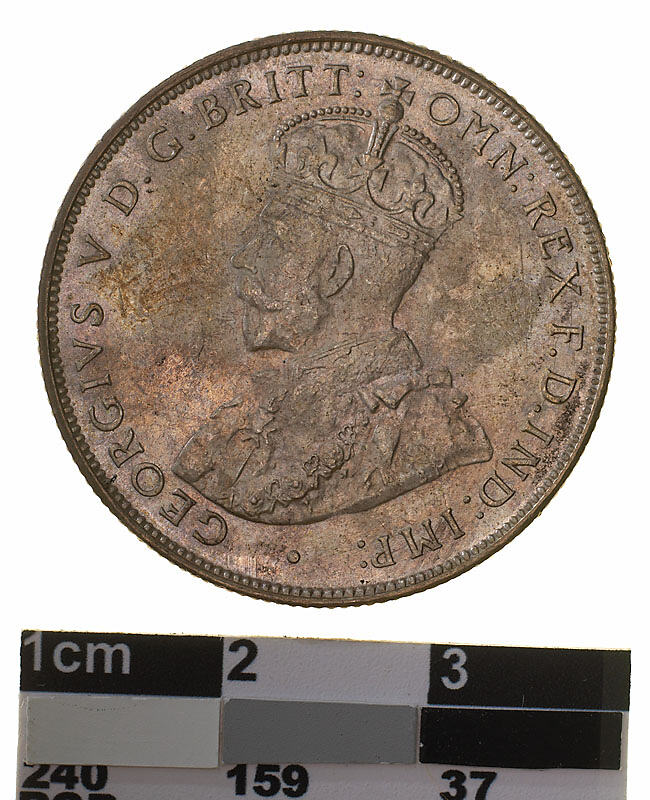Crowned and robed bust of George V facing left; around, GEORGIVS V D. G. BRITT: OMN: REX F. D. IND: IMP: ; below bust in small lettering the artist's initials B.M.