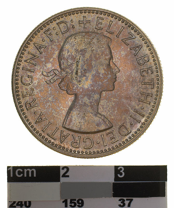 Bust of Elizabeth II laureate right; around, + ELIZABETH . II . DEI . GRATIA . REGINA . F:D: