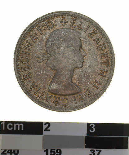 A silver coin (23.5 mm diameter with milled edge) featuring a laureate head of Elizabeth II facing right with the legend, + ELIZABETH . II . DEI . GRATIA . REGINA F: D: The artist's initials M.G. incuse on the bust truncation above the G of GRATIA. The reverse features a ram's head facing three-quarters left; around above, AUSTRALIA, around below between two Federation stars, SHILLING . 1955. The artist's initials, KG is in the field above the star on the right.