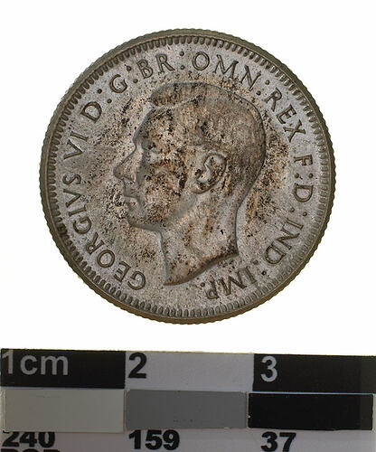 A silver coin (23.5 mm diameter with milled edge) featuring a bare head of George VI facing left; around, GEORGIVS VI D: G: BR: OMN: REX F. D. IND: IMP: ; below bust in small lettering the artist's initials H.P.. The reverse features a ram's head facing three-quarters left; around above, AUSTRALIA, around below between two Federation stars, SHILLING . 1940. The artist's initials, KG is in the field above the star on the right.