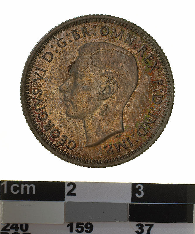 A silver coin (23.5 mm diameter with milled edge) featuring a bare head of George VI facing left; around, GEORGIVS VI D: G: BR: OMN: REX F. D. IND: IMP: ; below bust in small lettering the artist's initials H.P.. The reverse features a ram's head facing three-quarters left; around above, AUSTRALIA, around below between two Federation stars, SHILLING . 1942. The artist's initials, KG is in the field above the star on the right.