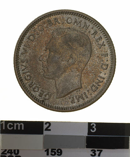 Between 1942 and 1944, on account of war efforts, mints in the United States of America and India were employed to strike coins for Australia. On this coin the mint mark, S for San Francisco, is in the field above the letter "N" of SHILLING.