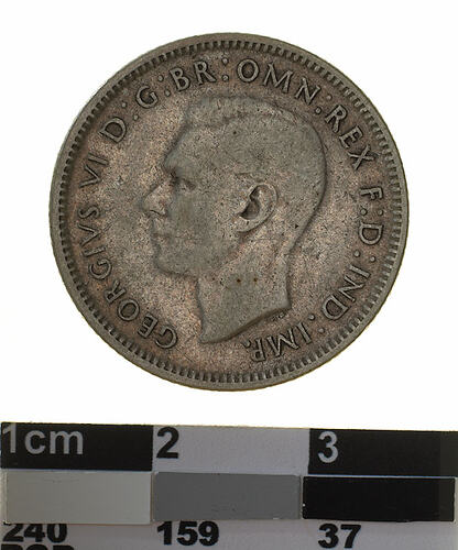 Between 1942 and 1944, on account of war efforts, mints in the United States of America and India were employed to strike coins for Australia. On this coin the mint mark, S for San Francisco, is in the field above the letter "N" of SHILLING.