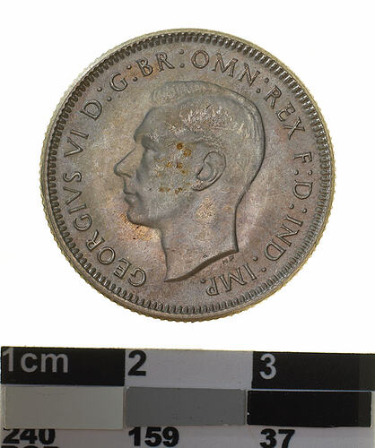 A silver coin (23.5 mm diameter with milled edge) featuring a bare head of George VI facing left; around, GEORGIVS VI D: G: BR: OMN: REX F. D. IND: IMP: ; below bust in small lettering the artist's initials H.P.. The reverse features a ram's head facing three-quarters left; around above, AUSTRALIA, around below between two Federation stars, SHILLING . 1946. The artist's initials, KG is in the field above the star on the right.