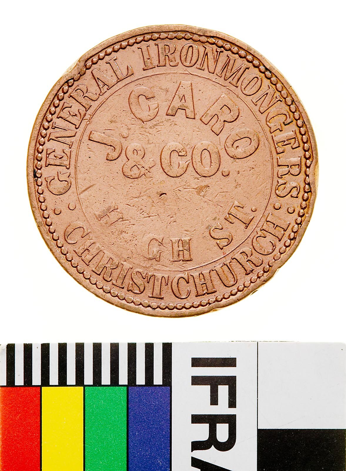 Copper One Penny Token, minted by Stokes, Melbourne. Issued by J. Caro & Co, General Ironmongers, Christchurch, circa 1863. J. Caro & Co was established in 1860 in High Street, Christchurch. The founder, J. Caro, sold it to Solomon Nashelski and his nephew in 1864. The business traded as S&H Nashelski until 1876, when it became S. Nashelski. In 1880 it was sold to Edward E. Ashby and L. Bergh, and it became a limited liability company in 1899. The business was still trading in 1950. In addition to trading as ironmongers, advertisements suggest that, in the late nineteenth century, the company was in the building trade, actually constructing buildings as well as selling the fittings for them.