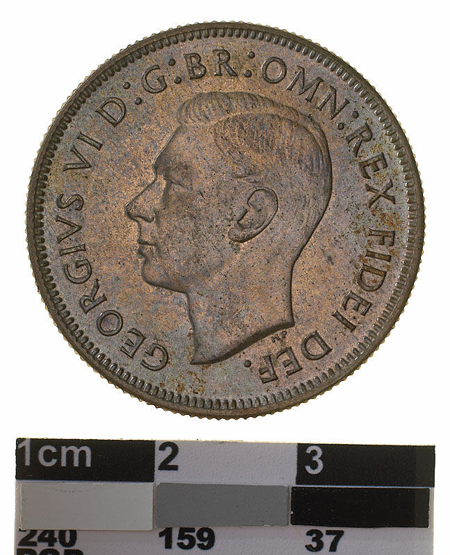 Bare head of George VI facing left; around, GEORGIVS VI D: G: BR: OMN: REX FIDEI DEF. ; below bust in small lettering the artist's initials H.P.
