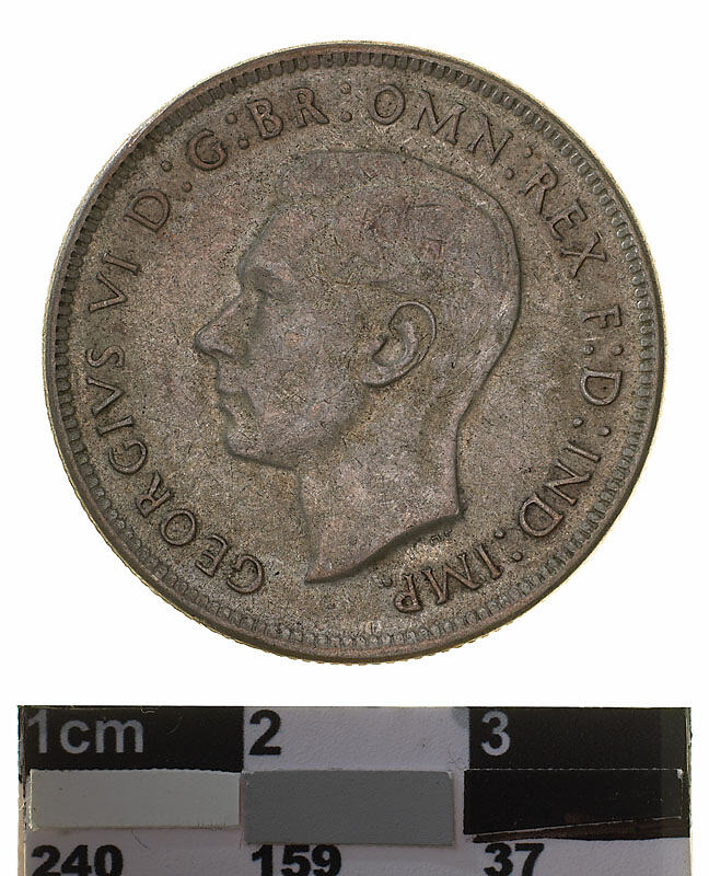 A silver coin (28 mm diameter with milled edge) featuring a bare head of George VI facing left; around, GEORGIVS VI D :G: BR: OMN: REX F .D. IND: IMP: ; below bust in small lettering the artist's initials H.P. The reverse features the Arms of the Commonwealth of Australia, as authorised by Royal Warrant 19 September 1912 - composed of a shield divided into six parts, each containing a representation of the badge of a State. The shield is supported by a kangaroo and an emu standing on a grassy mound accompanied by small branches of wattle. Above the shield is a crown. Around above, FLORIN between two seven pointed stars; and below, in the exergue, the date, 1941 curved below which, AUSTRALIA. The artist's initials KG are in the field above the back of the emu.