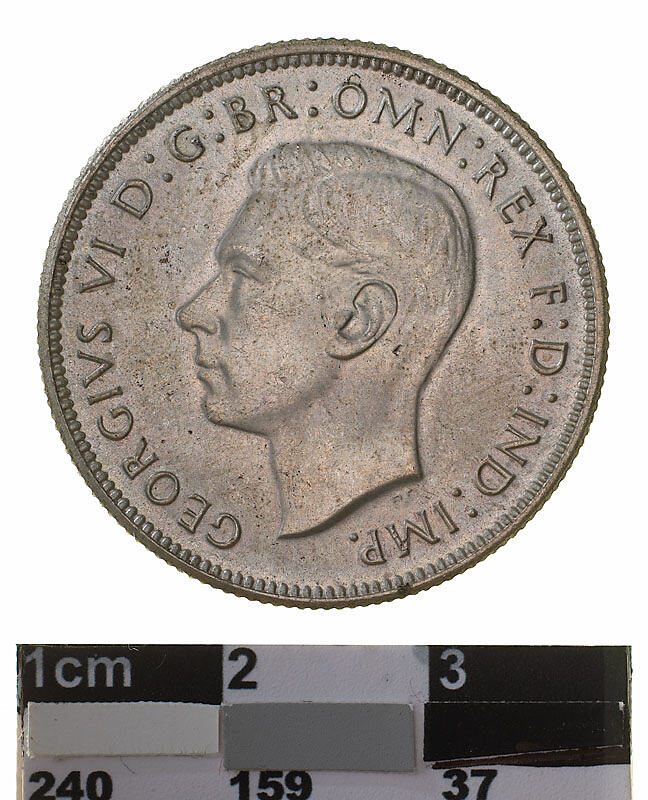 A silver coin (28 mm diameter with milled edge) featuring a bare head of George VI facing left; around, GEORGIVS VI D :G: BR: OMN: REX F .D. IND: IMP: ; below bust in small lettering the artist's initials H.P. The reverse features the Arms of the Commonwealth of Australia, as authorised by Royal Warrant 19 September 1912 - composed of a shield divided into six parts, each containing a representation of the badge of a State. The shield is supported by a kangaroo and an emu standing on a grassy mound accompanied by small branches of wattle. Above the shield is a crown. Around above, FLORIN between two seven pointed stars; and below, in the exergue, the date, 1940 curved below which, AUSTRALIA. The artist's initials KG are in the field above the back of the emu.