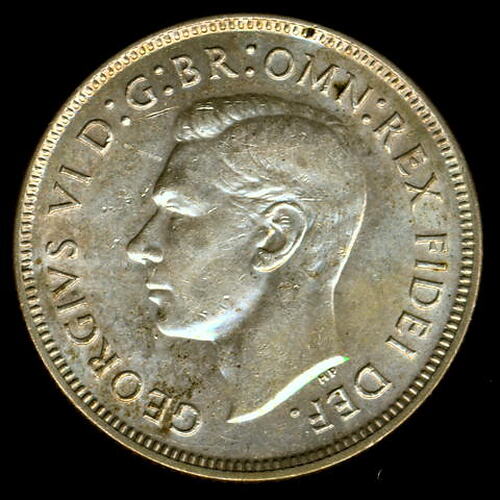Bare head of George VI facing left; around, GEORGIVS VI D: G: BR: OMN: REX FIDEI DEF. ; below bust in small lettering the artist's initials H.P.