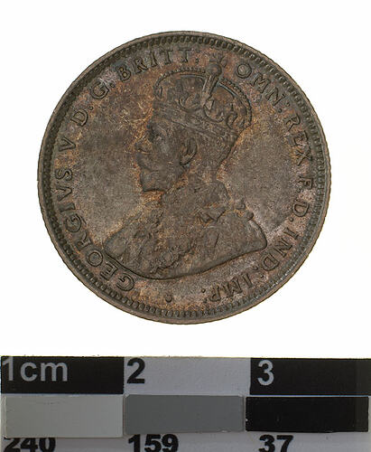 Crowned and robed bust of George V facing left; around, GEORGIVS V D.G. BRITT: OMN: REX F.D. IND: IMP: ; below bust in small lettering the artist's initials B.M.