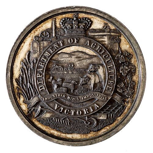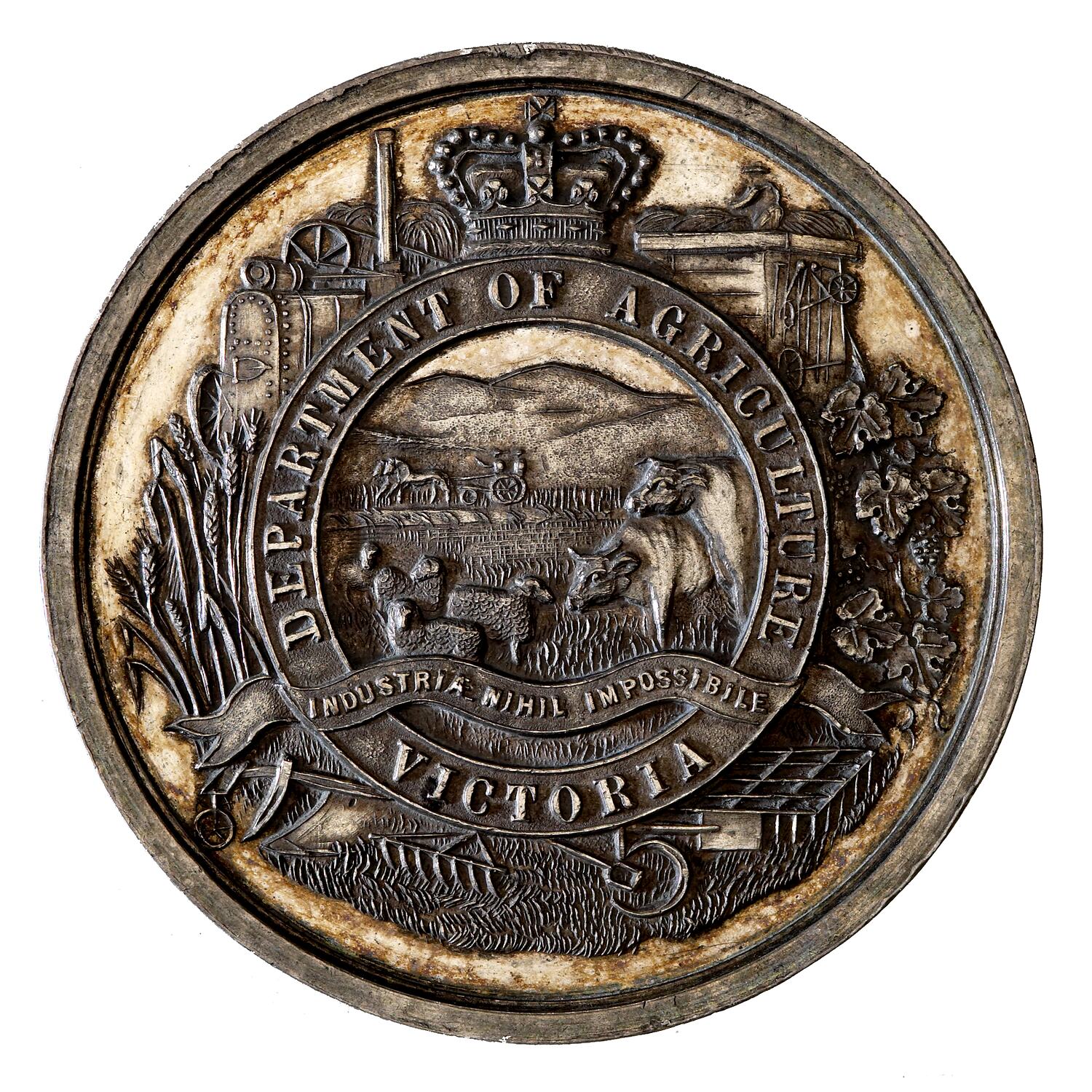At centre surmounted by crown an agricultural scene with horse, sheep, cow and pig in the foreground, and farmer and wife driving two horse buggy in the background; around, DEPARTMENT OF AGRICULTURE VICTORIA and the motto INDUSTRIAE NIHIL IMPOSSIBILE (with work nothing is impossible) on ribbon.