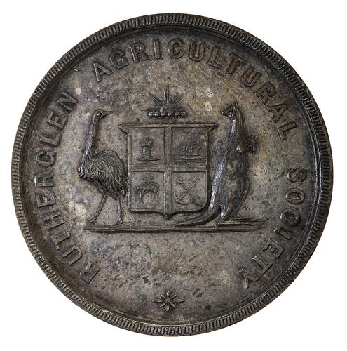 At centre Australian arms supported by emu and kangaroo; around, RUTHERGLEN AGRICULTURAL SOCIETY