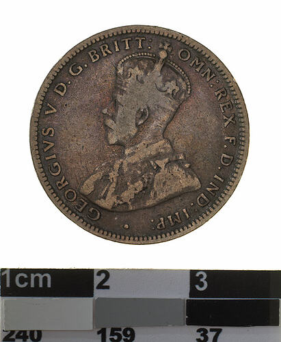 Obverse: GEORGIVS V D.G: BRITT: OMN: REX F.D. IND: IMP: Reverse: ONE SHILLING 1924 [ADVANCE AUSTRALIA]