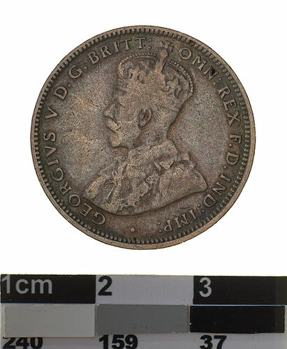 Crowned and robed bust of George V facing left; around, GEORGIVS V D.G: BRITT: OMN: REX F.D. IND: IMP: ; below bust in small lettering the artist's initials B.M.
