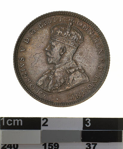 A silver coin (23.5 mm diameter with milled edge) featuring a crowned and robed bust of George V facing left; around, GEORGIVS V D. G. BRITT: OMN: REX F. D. IND: IMP: ; below bust in small lettering the artist's initials B.M. The reverse features the Ensigns Armorial of the Commonwealth of Australia, as authorised by Royal Warrent 7th May 1908 - composed of a simple shield enclosing a cross of Saint George on which are five six-pointed stars, around the outside of which are six small escutcheons, i.e., small shields. The shield is supported by a kangaroo and an emu standing on a grassy mound. Above the shield a crest, the seven-pointed star of Federation on a wreath. Below on a ribbon the motto ADVANCE AUSTRALIA is inscribed. Around above, ONE SHILLING and below, between arrow heads, the date, 1916. Below the date is the mint mark M.