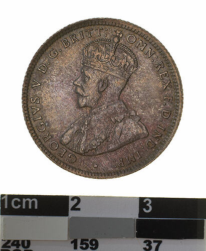 A silver coin (23.5 mm diameter with milled edge) featuring a crowned and robed bust of George V facing left; around, GEORGIVS V D.G: BRITT: OMN: REX F.D. IND: IMP: ; below bust in small lettering the artist's initials B.M. The reverse features the Ensigns Armorial of the Commonwealth of Australia, as authorised by Royal Warrent 7th May 1908 - composed of a simple shield enclosing a cross of Saint George on which are five six-pointed stars, around the outside of which are six small escutcheons, i.e., small shields. The shield is supported by a kangaroo and an emu standing on a grassy mound. Above the shield a crest, the seven-pointed star of Federation on a wreath. Below on a ribbon the motto ADVANCE AUSTRALIA is inscribed. Around above, ONE SHILLING and below, between arrow heads, the date, 1913.