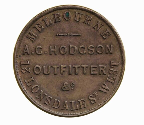 Obverse: MELBOURNE A.G.HODGSON OUTFITTER &c. 13 LONSDALE ST. WEST Reverse: VICTORIA 1862 COARD LONDON