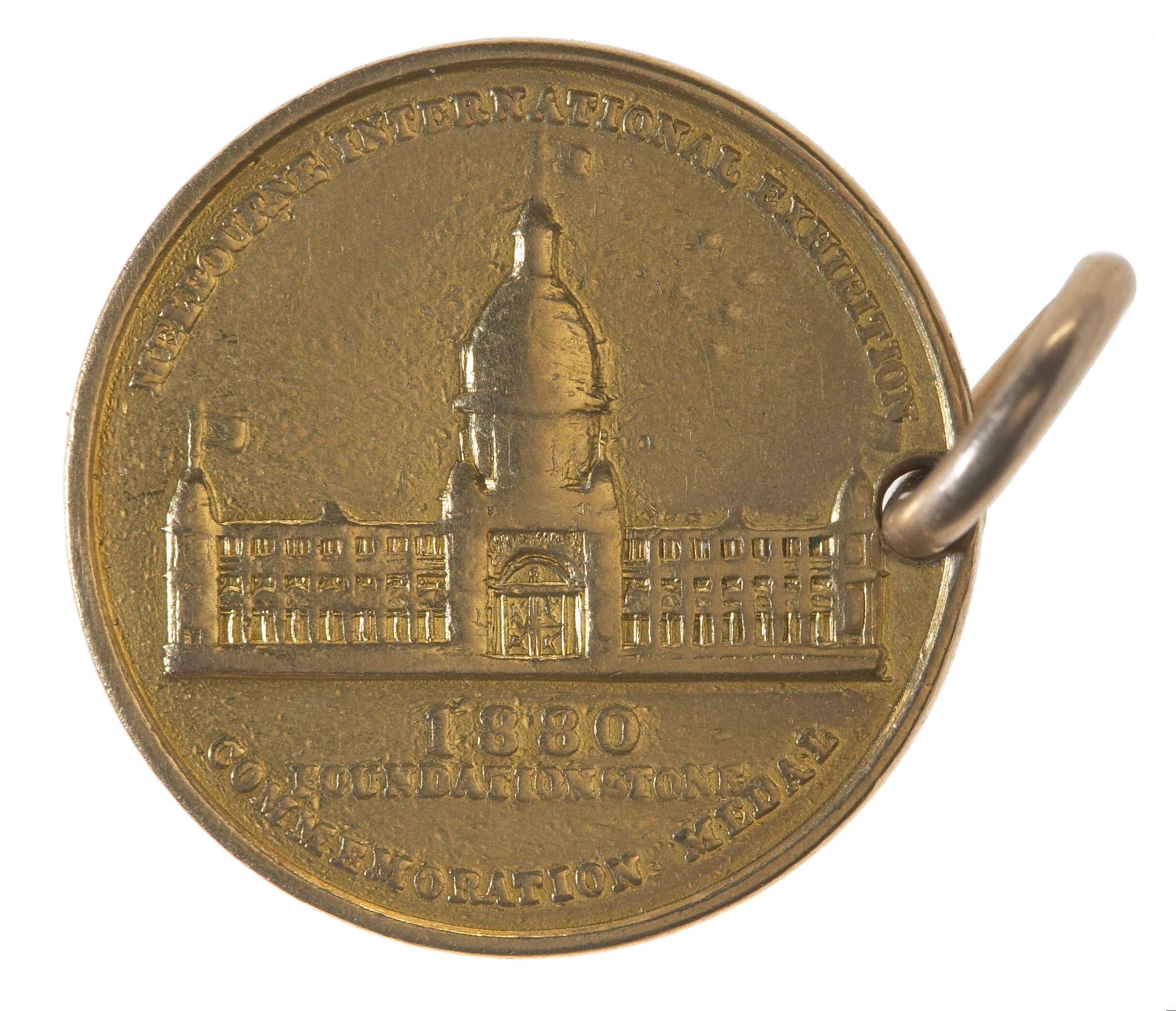 Other Details: This gold medal was issued to commemorate the laying of the Foundation Stone for the Melbourne Exhibition Building. It was given to John McIntyre, businessman and politician, who had lost the seat of Sandhurst just before the Exhibition. McIntyre had represented Victoria at the 1876 Philadelphia Centennial Exhibition, partly to observe arrangements in order to assist Victoria to plan its own centennial celebrations. In 1880 and 1888 he was an ex-officio Commissioner for Melbourne's international exhibitions. Gold medals were distributed in February 1879, manufactured by the Melbourne Mint. The Mint also prepared two silver and ond bronze pieces for its own collection. The Melbourne International Exhibition ran from 1 October 1880 to 30 April 1881. The exhibition building that still stands was constructed for the occasion, designed by Joseph Reed and built by David Mitchell. Over 1.3 million people visited the exhibition at a time when Melbourne's population was only around 282,000.